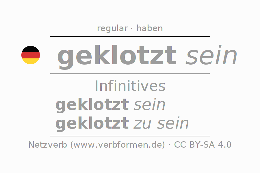 The conjugation of klotzen in Infinitive Present Perfect base form Statal Passive is geklotzt sein, geklotzt zu sein.The conjugation corresponds to certain grammatical rules. Likewise the requirements for the conjugation of the simple verb forms of klotzen in Infinitive. Comments ☆