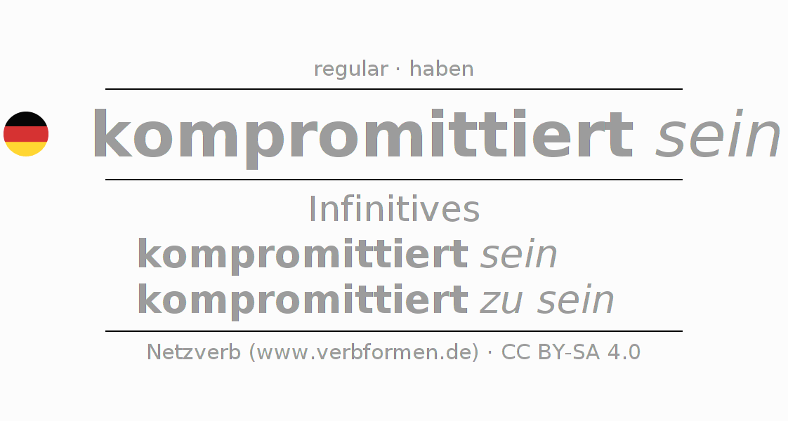 The conjugation of kompromittieren in Infinitive Present Perfect base form Statal Passive is kompromittiert sein, kompromittiert zu sein.The conjugation corresponds to certain grammatical rules. Likewise the requirements for the conjugation of the simple verb forms of kompromittieren in Infinitive. Comments ☆