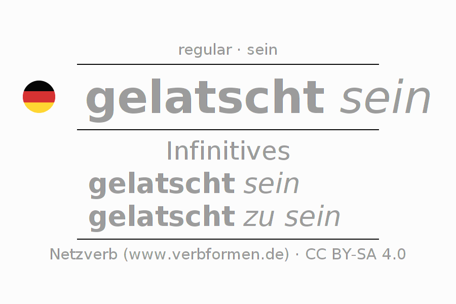 The conjugation of latschen in Infinitive Present Perfect base form Statal Passive is gelatscht sein, gelatscht zu sein.The conjugation corresponds to certain grammatical rules. Likewise the requirements for the conjugation of the simple verb forms of latschen in Infinitive. Comments ☆