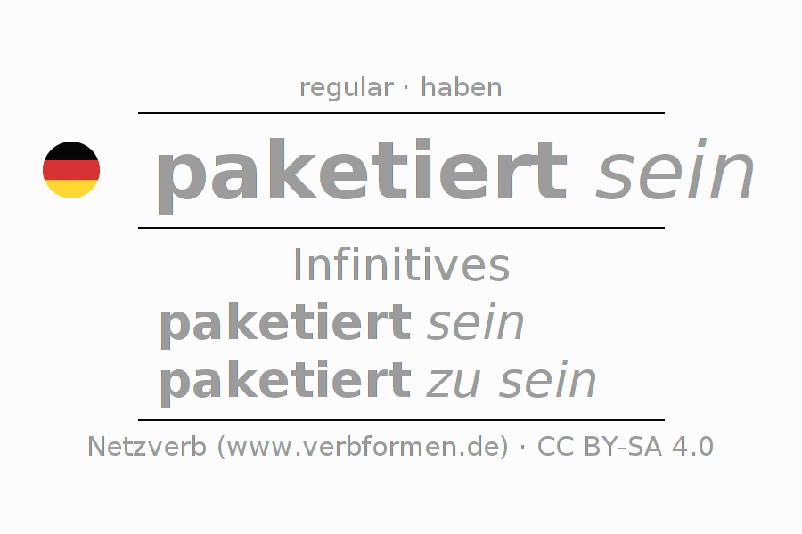 The conjugation of paketieren in Infinitive Present Perfect base form Statal Passive is paketiert sein, paketiert zu sein.The conjugation corresponds to certain grammatical rules. Likewise the requirements for the conjugation of the simple verb forms of paketieren in Infinitive. Comments ☆