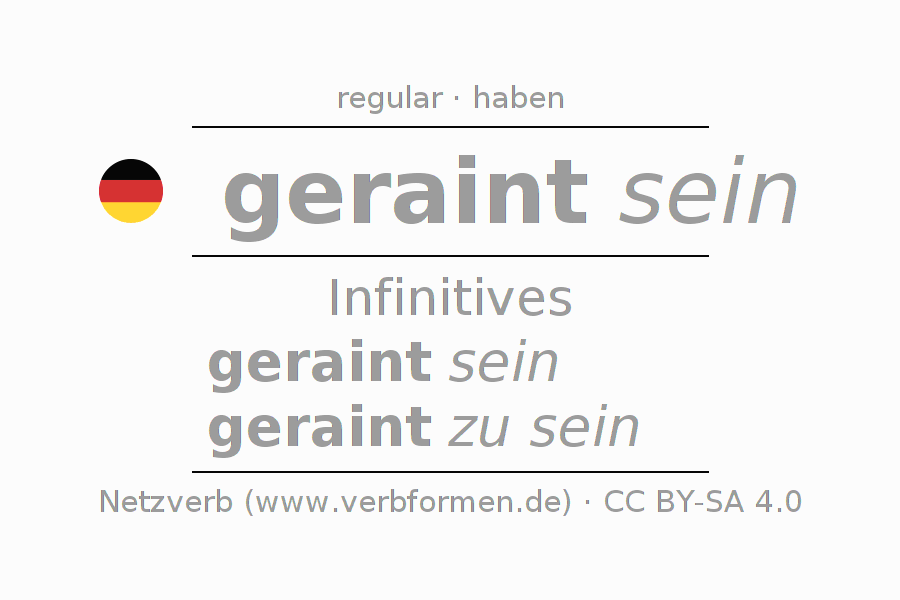 The conjugation of rainen in Infinitive Present Perfect base form Statal Passive is geraint sein, geraint zu sein.The conjugation corresponds to certain grammatical rules. Likewise the requirements for the conjugation of the simple verb forms of rainen in Infinitive. Comments ☆