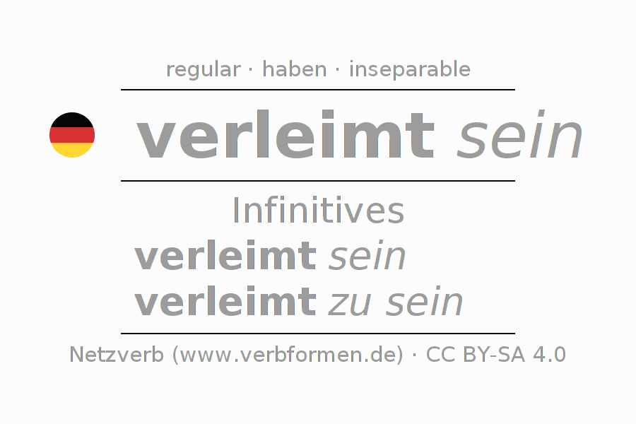 The conjugation of verleimen in Infinitive Present Perfect base form Statal Passive is verleimt sein, verleimt zu sein.The conjugation corresponds to certain grammatical rules. Likewise the requirements for the conjugation of the simple verb forms of verleimen in Infinitive. Comments ☆