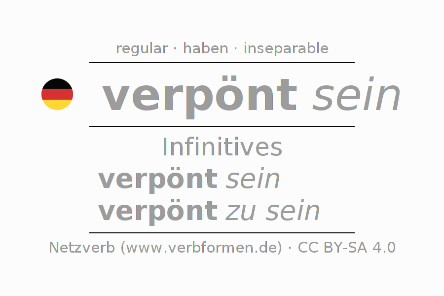 The conjugation of verpönen in Infinitive Present Perfect base form Statal Passive is verpönt sein, verpönt zu sein.The conjugation corresponds to certain grammatical rules. Likewise the requirements for the conjugation of the simple verb forms of verpönen in Infinitive. Comments ☆
