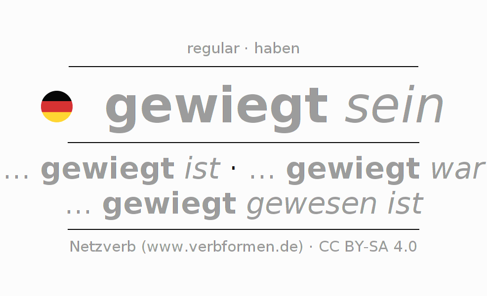 The conjugation of wiegen in Infinitive Present Perfect base form Statal Passive is gewiegt sein, gewiegt zu sein.The conjugation corresponds to certain grammatical rules. Likewise the requirements for the conjugation of the simple verb forms of wiegen in Infinitive. Comments ☆
