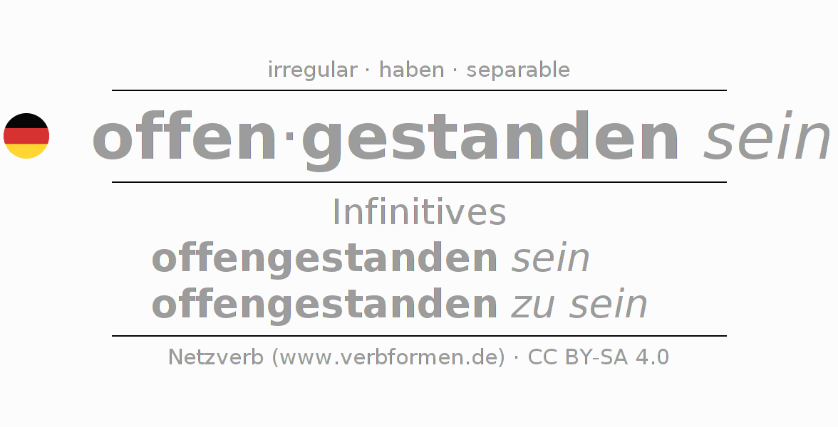 The conjugation of offenstehen in Infinitive Present Perfect base form Statal Passive is offengestanden sein, offengestanden zu sein.The conjugation corresponds to certain grammatical rules. Likewise the requirements for the conjugation of the simple verb forms of offenstehen in Infinitive. Comments ☆