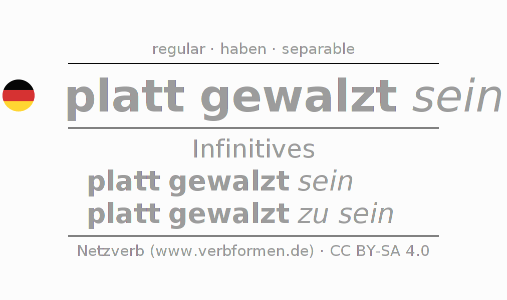 The conjugation of plattwalzen in Infinitive Present Perfect base form Statal Passive is platt gewalzt sein, platt gewalzt zu sein.The conjugation corresponds to certain grammatical rules. Likewise the requirements for the conjugation of the simple verb forms of plattwalzen in Infinitive. Comments ☆