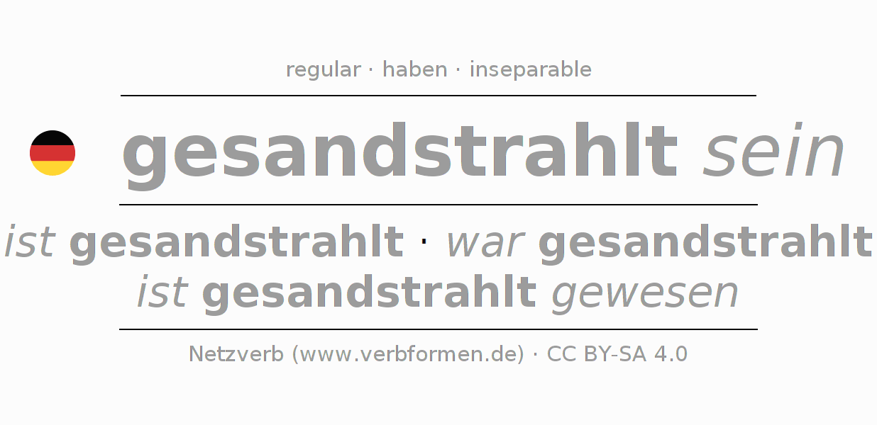 The conjugation of sandstrahlen in Infinitive Present Perfect base form Statal Passive is gesandstrahlt sein, gesandstrahlt zu sein.The conjugation corresponds to certain grammatical rules. Likewise the requirements for the conjugation of the simple verb forms of sandstrahlen in Infinitive. Comments ☆