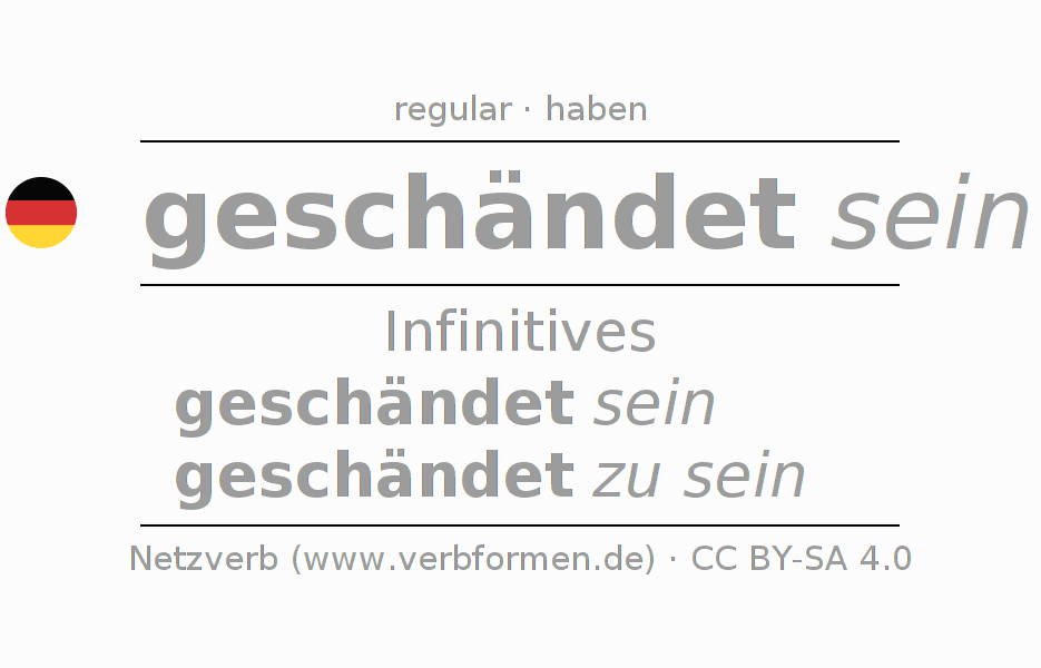 The conjugation of schänden in Infinitive Present Perfect base form Statal Passive is geschändet sein, geschändet zu sein.The conjugation corresponds to certain grammatical rules. Likewise the requirements for the conjugation of the simple verb forms of schänden in Infinitive. Comments ☆