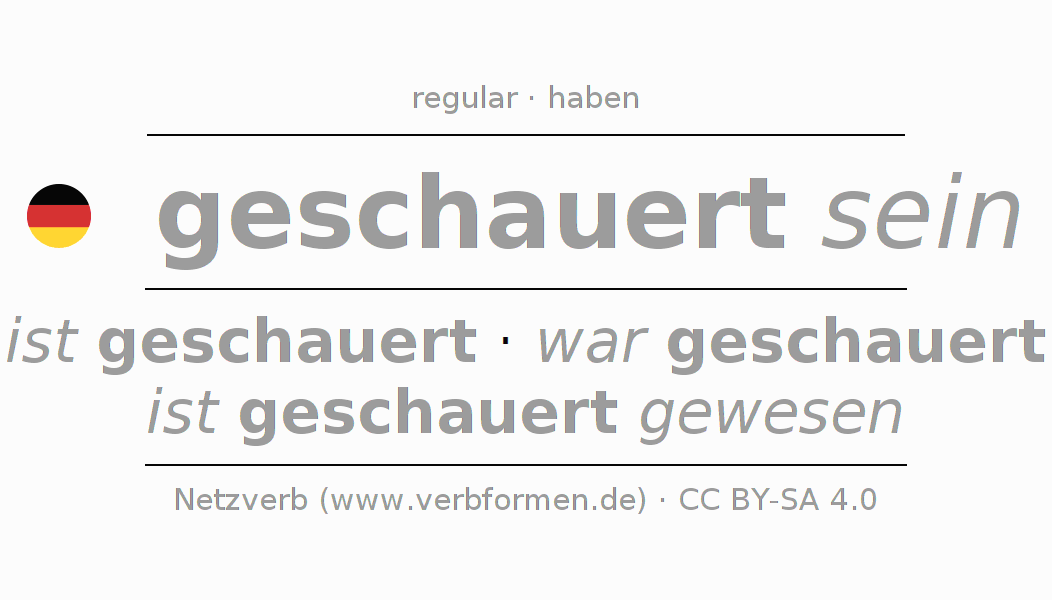 The conjugation of schauern in Infinitive Present Perfect base form Statal Passive is geschauert sein, geschauert zu sein.The conjugation corresponds to certain grammatical rules. Likewise the requirements for the conjugation of the simple verb forms of schauern in Infinitive. Comments ☆