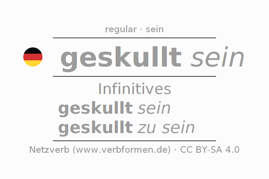 The conjugation of skullen in Infinitive Present Perfect base form Statal Passive is geskullt sein, geskullt zu sein.The conjugation corresponds to certain grammatical rules. Likewise the requirements for the conjugation of the simple verb forms of skullen in Infinitive. Comments ☆