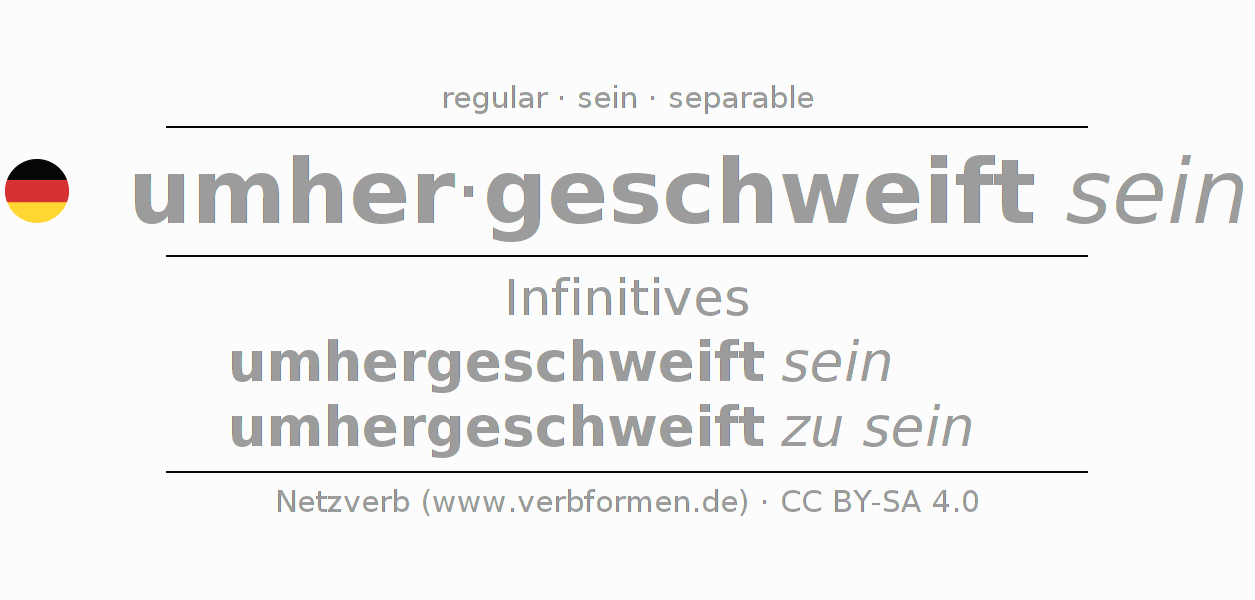 The conjugation of umherschweifen in Infinitive Present Perfect base form Statal Passive is umhergeschweift sein, umhergeschweift zu sein.The conjugation corresponds to certain grammatical rules. Likewise the requirements for the conjugation of the simple verb forms of umherschweifen in Infinitive. Comments ☆