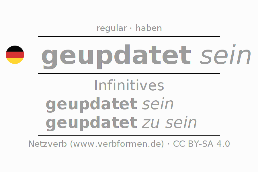 The conjugation of updaten in Infinitive Present Perfect base form Statal Passive is geupdatet sein, geupdatet zu sein.The conjugation corresponds to certain grammatical rules. Likewise the requirements for the conjugation of the simple verb forms of updaten in Infinitive. Comments ☆