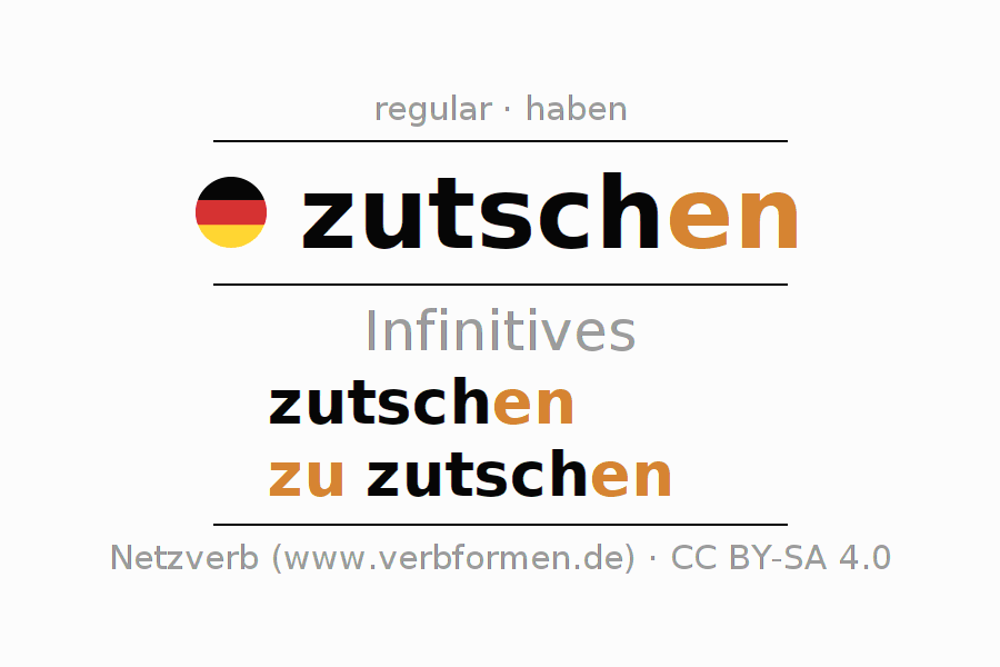 The infinitives of zutschen (slurp, suck) are: zutschen, zu zutschen. The ending -en is appended to the verb stem zutsch. When forming the infinitive with zu, the "zu" is prepended to the verb, since it has no separable first parts. The formation of the forms corresponds to the grammatical rules for the conjugation of verbs in the infinitive. Comments ☆