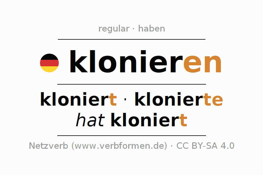 - Future: ich werde klonieren, du werdest klonieren, er werde klonieren, wir werden klonieren, ihr werdet klonieren, sie werden klonieren