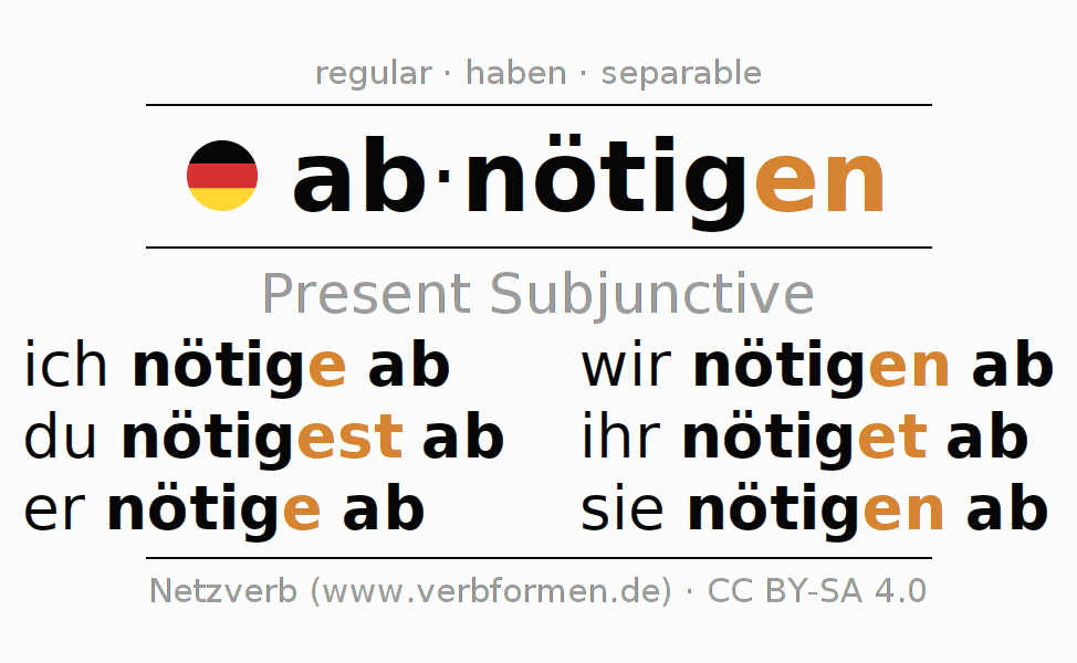 The conjugation of abnötigen (coerce, extort) in subjunctive I is: ich nötige ab, du nötigest ab, er nötige ab, wir nötigen ab, ihr nötiget ab, sie nötigen ab. The endings -e, -est, -e, -en, -et, -en are appended to the base or verb stem nötig. The prefix ab- of abnötigen is separated. The conjugation of these forms conforms to the grammatical rules for verbs in the subjunctive I tense.