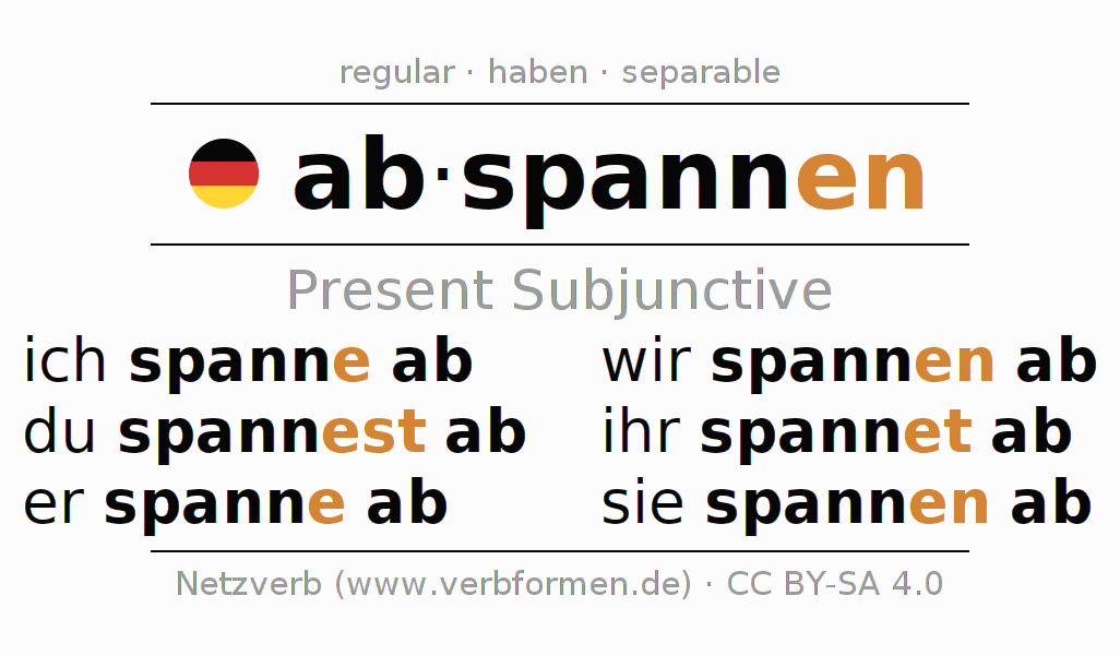The verb abspannen fully conjugated in all persons and numbers in the Subjunctive Present