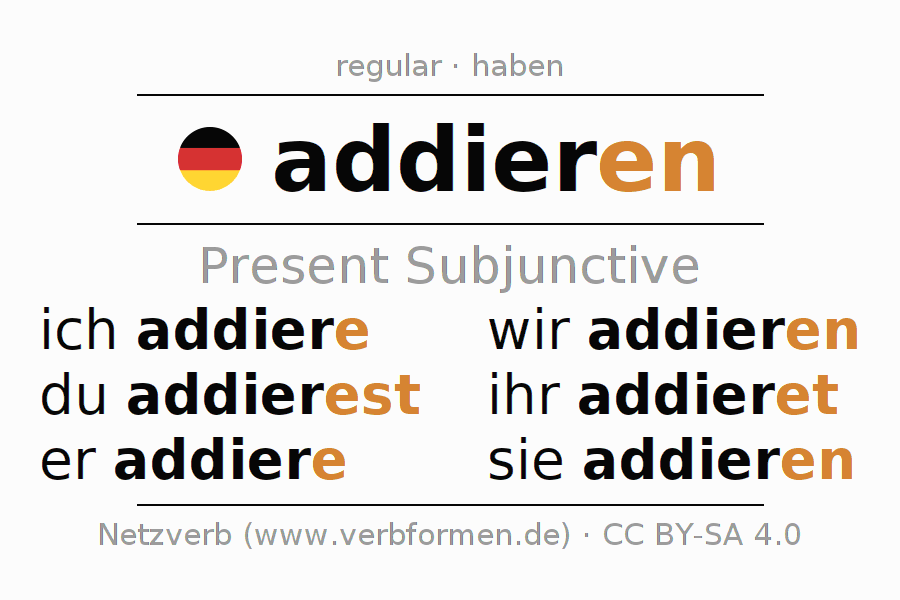 The verb addieren fully conjugated in all persons and numbers in the Subjunctive Present