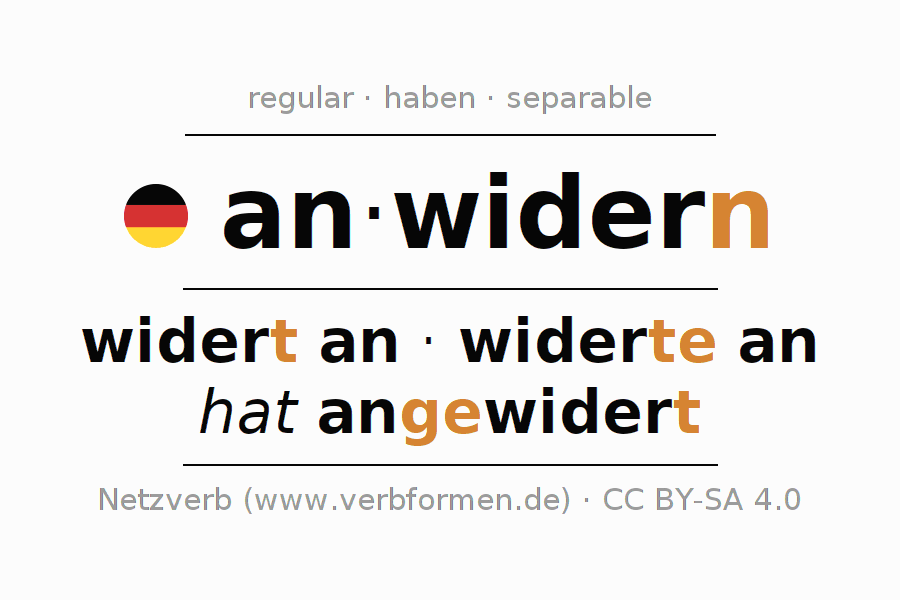 The conjugation of anwidern (disgust, cloy) in subjunctive I is: ich wid(e)re an, du widerst an, er wid(e)re an, wir widern an, ihr widert an, sie widern an. The endings -e, -st, -e, -n, -t, -n are appended to the base or verb stem wider. The prefix an- of anwidern is separated. The conjugation of these forms conforms to the grammatical rules for verbs in the subjunctive I tense.