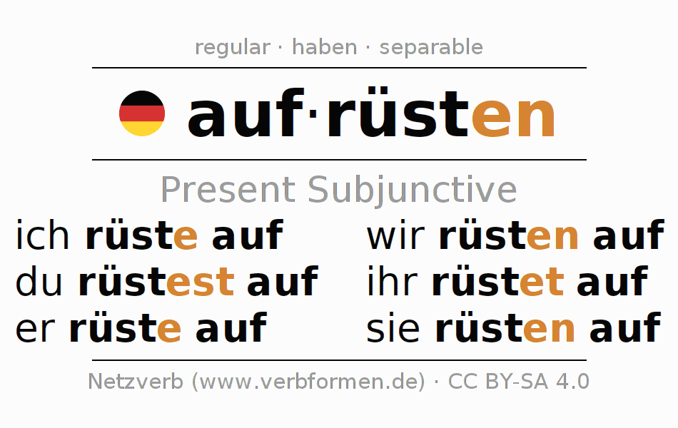 The verb aufrüsten fully conjugated in all persons and numbers in the Subjunctive Present