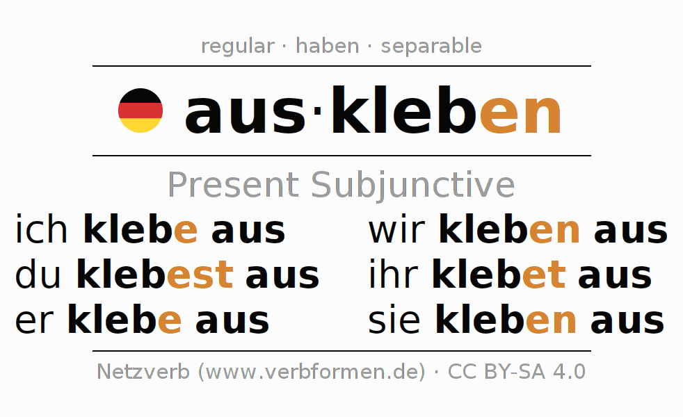 The verb auskleben fully conjugated in all persons and numbers in the Subjunctive Present