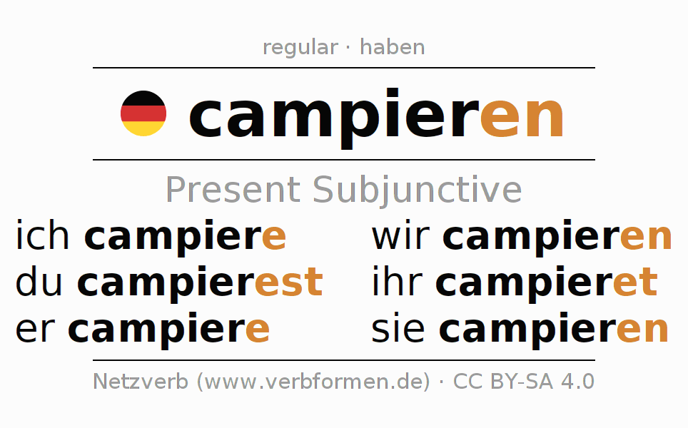 The verb campieren fully conjugated in all persons and numbers in the Subjunctive Present