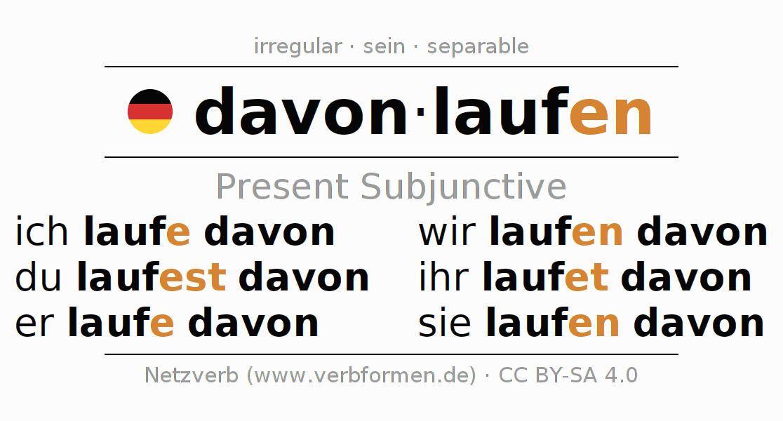 The verb davonlaufen fully conjugated in all persons and numbers in the Subjunctive Present