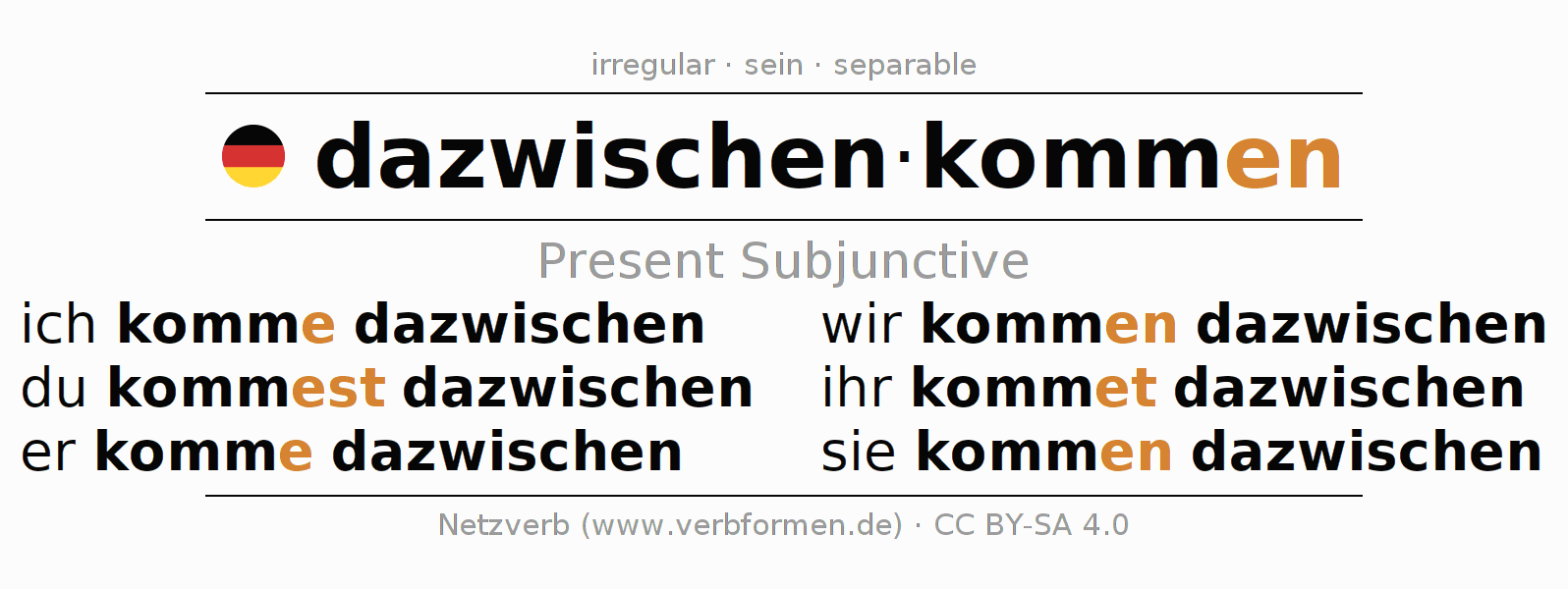 The verb dazwischenkommen fully conjugated in all persons and numbers in the Subjunctive Present