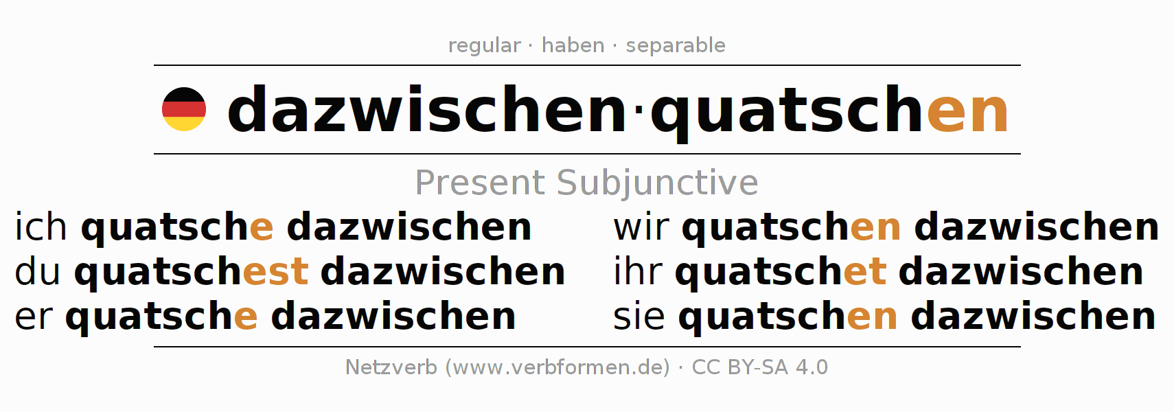 The verb dazwischenquatschen fully conjugated in all persons and numbers in the Subjunctive Present