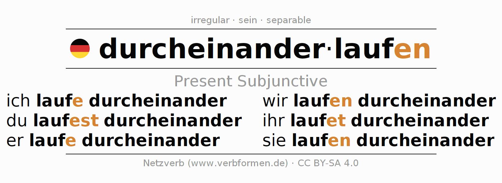 The verb durcheinanderlaufen fully conjugated in all persons and numbers in the Subjunctive Present