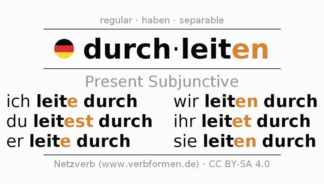 The verb durchleiten fully conjugated in all persons and numbers in the Subjunctive Present
