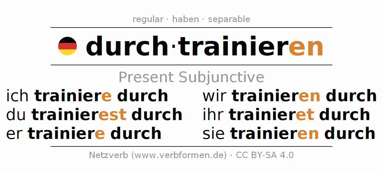 The verb durchtrainieren fully conjugated in all persons and numbers in the Subjunctive Present
