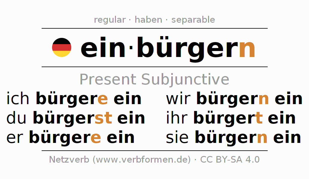 The verb einbürgern fully conjugated in all persons and numbers in the Subjunctive Present