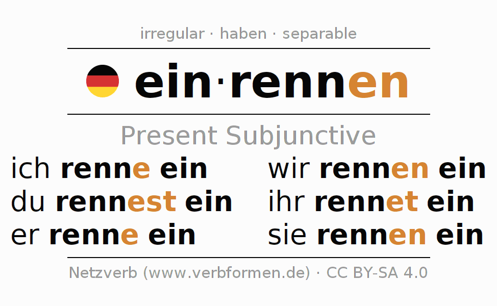 The verb einrennen fully conjugated in all persons and numbers in the Subjunctive Present