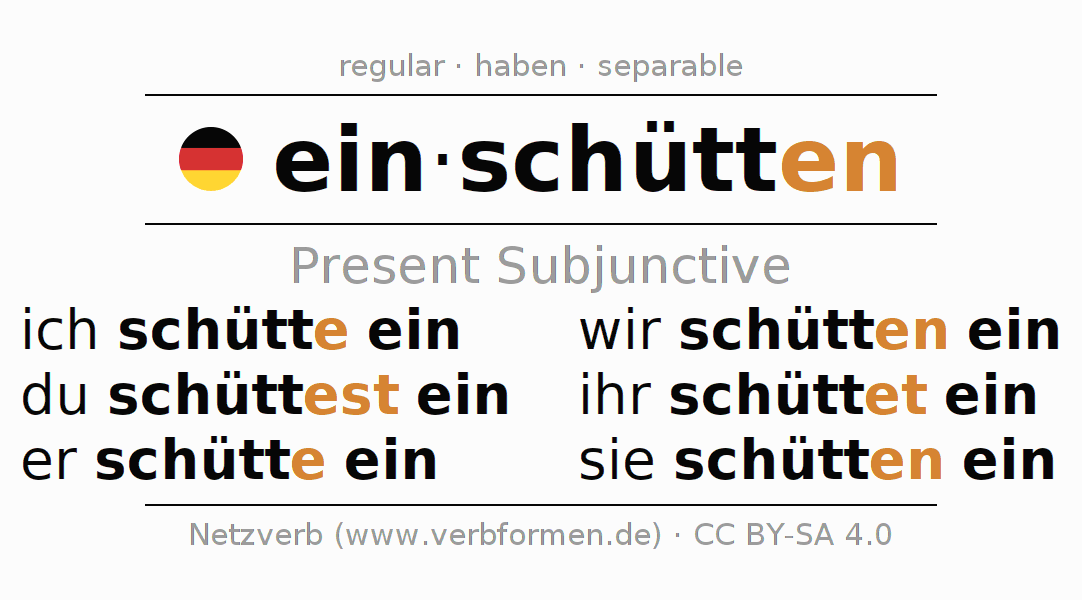The verb einschütten fully conjugated in all persons and numbers in the Subjunctive Present