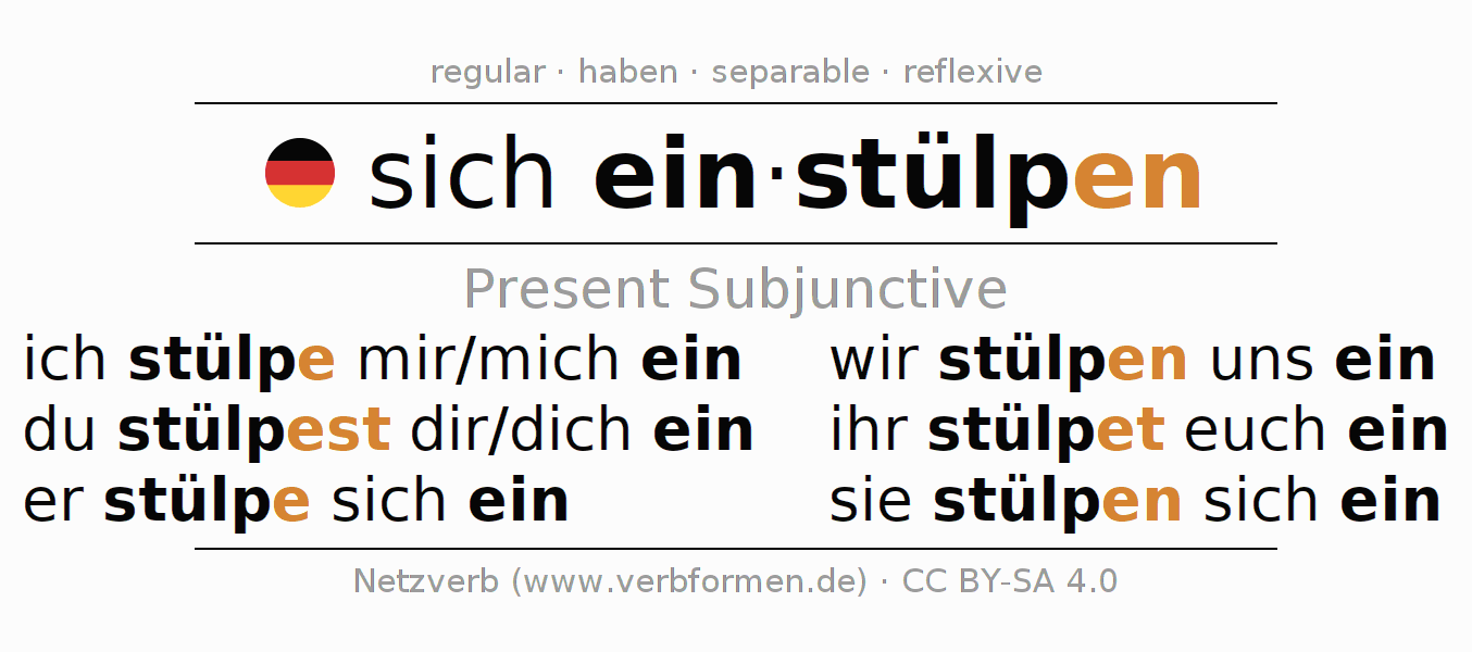The verb sich einstülpen fully conjugated in all persons and numbers in the Subjunctive Present