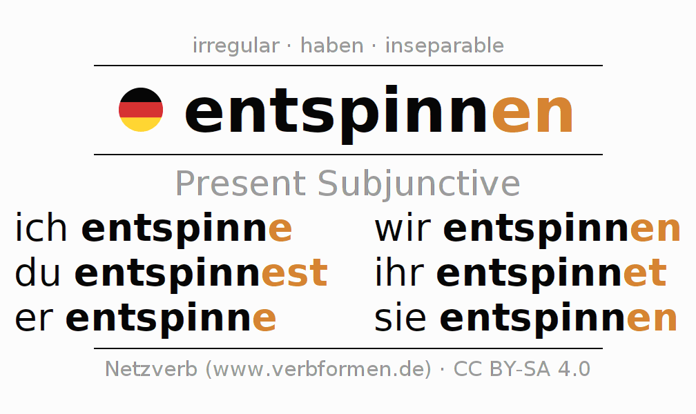 The verb entspinnen fully conjugated in all persons and numbers in the Subjunctive Present