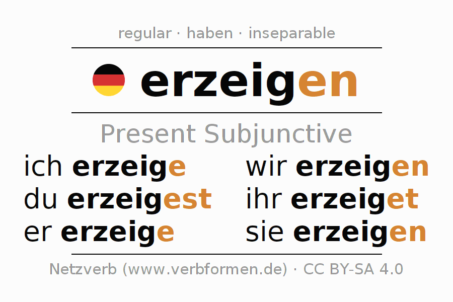 The verb erzeigen fully conjugated in all persons and numbers in the Subjunctive Present