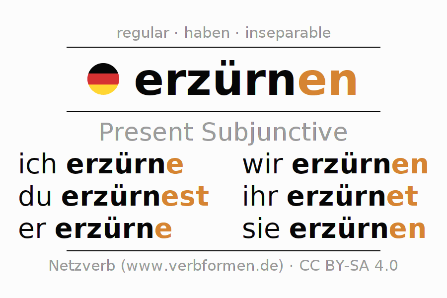 The verb erzürnen (hat) fully conjugated in all persons and numbers in the Subjunctive Present