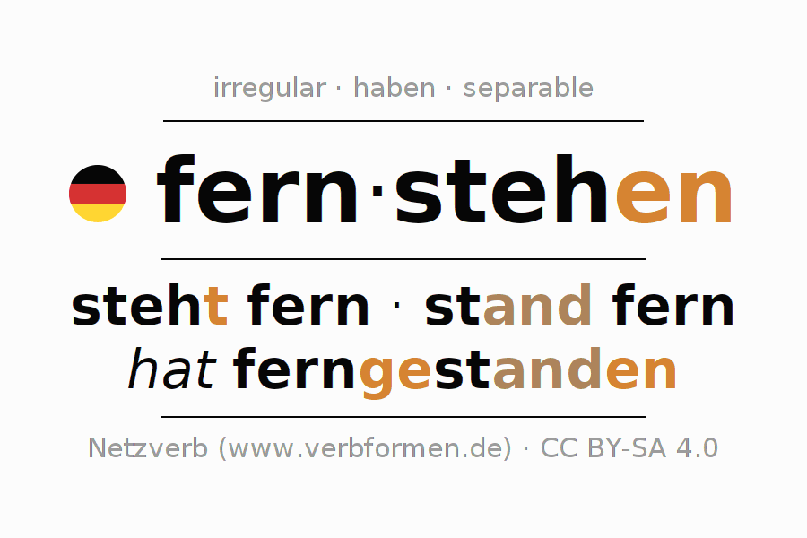 The conjugation of fernstehen (aloof, distant) in subjunctive I is: ich stehe fern, du stehest fern, er stehe fern, wir stehen fern, ihr stehet fern, sie stehen fern. The endings -e, -est, -e, -en, -et, -en are appended to the base or verb stem steh. The prefix fern- of fernstehen is separated. The conjugation of these forms conforms to the grammatical rules for verbs in the subjunctive I tense.