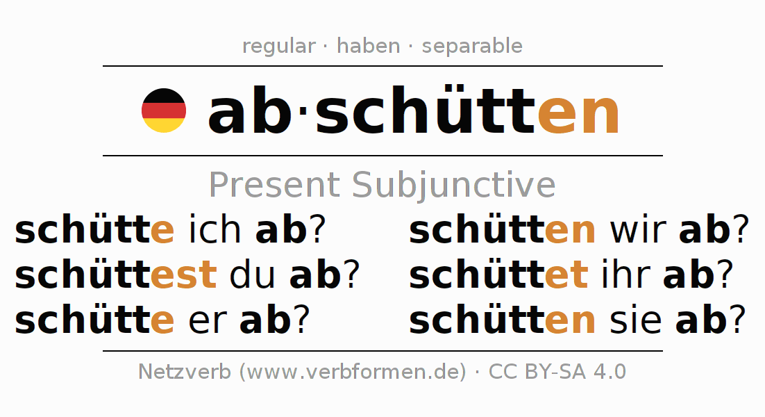 The verb abschütten fully conjugated in all persons and numbers in the Subjunctive Present