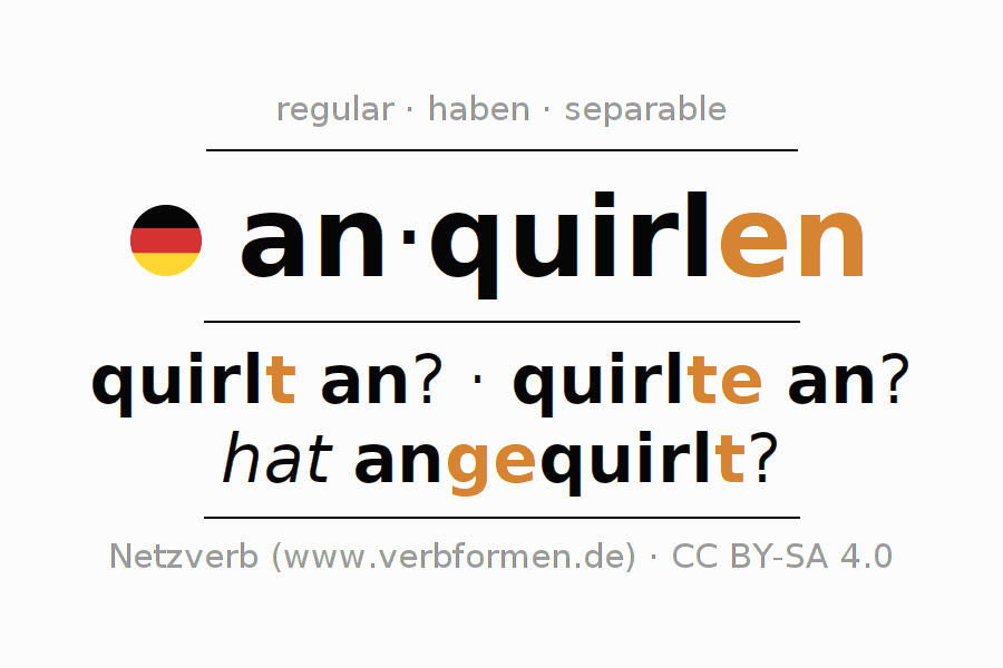 The conjugation of anquirlen in Subjunctive Present Form of possibility Active is quirle ich an?, quirlest du an?, quirle er an?, quirlen wir an?, quirlet ihr an?, quirlen sie an?.The conjugation corresponds to certain grammatical rules. Likewise the requirements for the conjugation of the simple verb forms of anquirlen in Present Subjunctive. Comments ☆