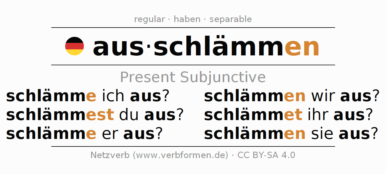 The verb ausschlämmen fully conjugated in all persons and numbers in the Subjunctive Present