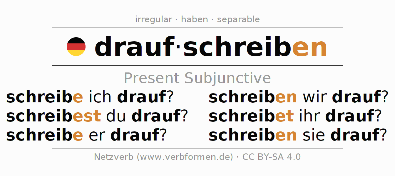 The conjugation of draufschreiben in Subjunctive Present Form of possibility Active is schreibe ich drauf?, schreibest du drauf?, schreibe er drauf?, schreiben wir drauf?, schreibet ihr drauf?, schreiben sie drauf?.The conjugation corresponds to certain grammatical rules. Likewise the requirements for the conjugation of the simple verb forms of draufschreiben in Present Subjunctive. Comments ☆