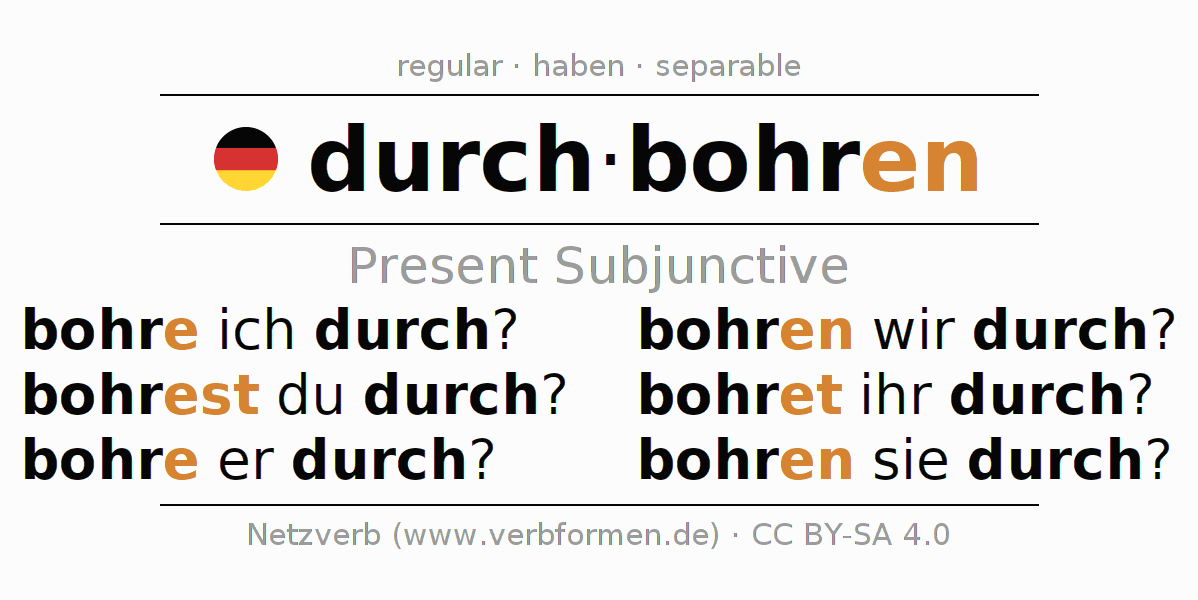 The conjugation of durchbohren in Subjunctive Present Form of possibility Active is bohre ich durch?, bohrest du durch?, bohre er durch?, bohren wir durch?, bohret ihr durch?, bohren sie durch?.The conjugation corresponds to certain grammatical rules. Likewise the requirements for the conjugation of the simple verb forms of durchbohren in Present Subjunctive. Comments ☆