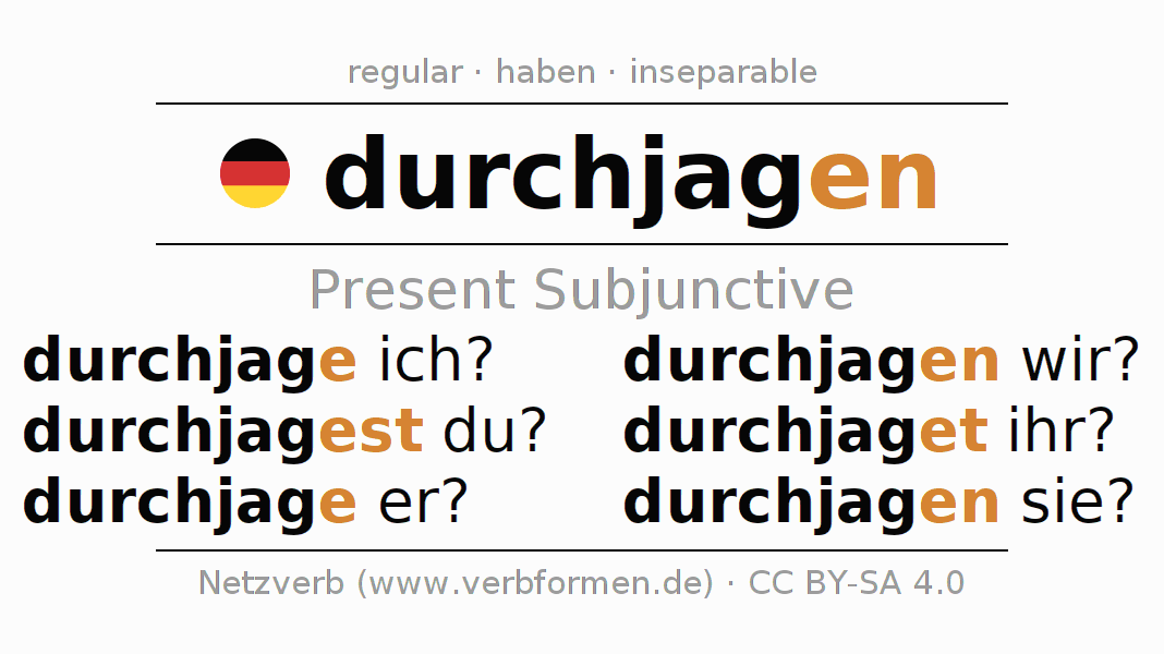 The verb durchjagen (hat) fully conjugated in all persons and numbers in the Subjunctive Present