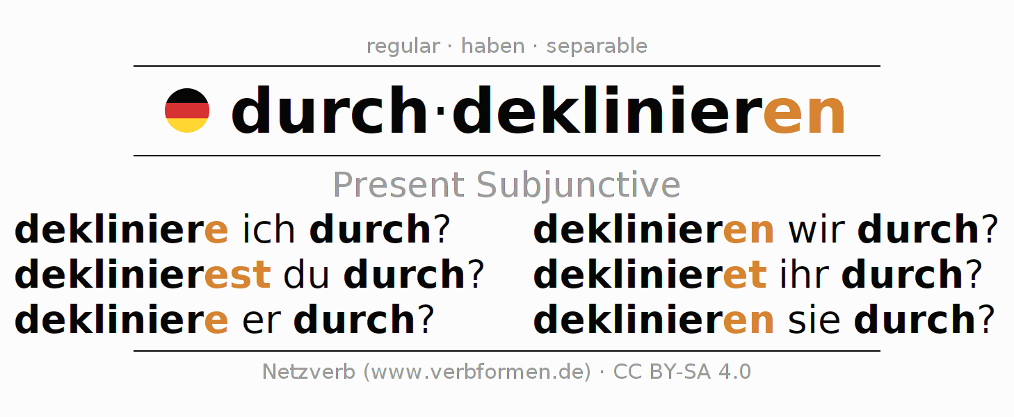 The verb durchdeklinieren fully conjugated in all persons and numbers in the Subjunctive Present