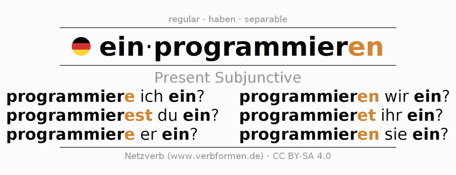 The verb einprogrammieren fully conjugated in all persons and numbers in the Subjunctive Present