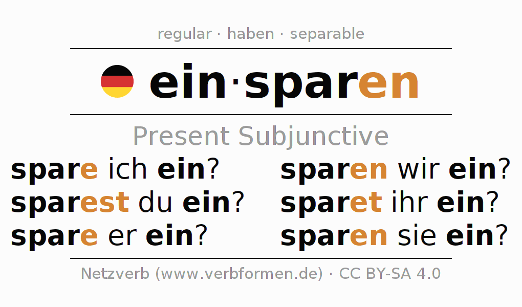 The conjugation of einsparen in Subjunctive Present Form of possibility Active is spare ich ein?, sparest du ein?, spare er ein?, sparen wir ein?, sparet ihr ein?, sparen sie ein?.The conjugation corresponds to certain grammatical rules. Likewise the requirements for the conjugation of the simple verb forms of einsparen in Present Subjunctive. Comments ☆
