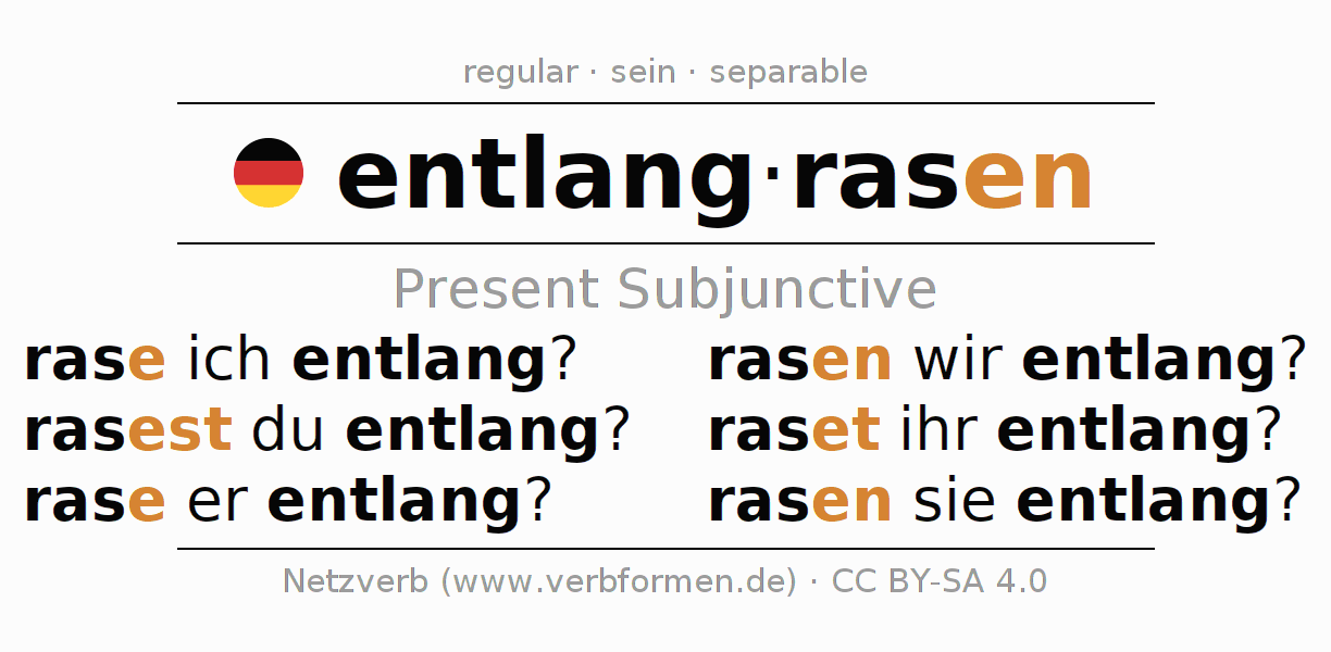 The conjugation of entlangrasen in Subjunctive Present Form of possibility Active is rase ich entlang?, rasest du entlang?, rase er entlang?, rasen wir entlang?, raset ihr entlang?, rasen sie entlang?.The conjugation corresponds to certain grammatical rules. Likewise the requirements for the conjugation of the simple verb forms of entlangrasen in Present Subjunctive. Comments ☆