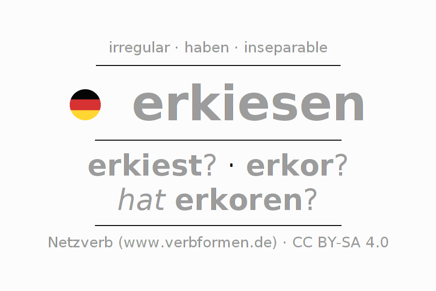 The conjugation of erkiesen in Subjunctive Present Form of possibility Active is erkiese ich?, erkiesest du?, erkiese er?, erkiesen wir?, erkieset ihr?, erkiesen sie?.The conjugation corresponds to certain grammatical rules. Likewise the requirements for the conjugation of the simple verb forms of erkiesen in Present Subjunctive. Comments ☆
